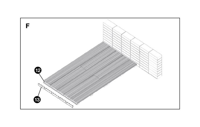 - När alla brädorna ligger på plats efterdrar du alla monteringsclips mellan brädorna ordentligt. En alternativ metod är att lägga den sista raden med brädor som tidigare, och förborra och skruva snett ner i det längsgående spåret på den yttersta brädan, ner i regeln under med en rostfri skruv.