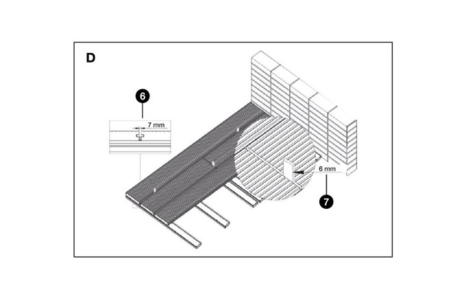 - Vid längsgående fogar ska det vara minst 6 mm mellanrum för att det ska finnas plats för expansion hos brädorna. Använd lämplig kloss för att säkerställa att avståndet är detsamma. Om en regel eller skarv är för smal för att båda monteringsclipsen ska få plats, måste du skruva fast en extra bit regel i den befintliga regeln.