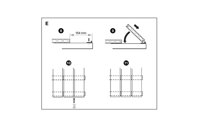 - Montera det yttre bordets startclips. Startclipsens ytterkant placeras 154 mm från den näst yttersta brädans kant och skruvas fast.
