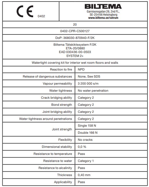 Tätskiktssystem F består av ett färdigblandat medel samt folieduk som tapetseras upp. Systemet kompletteras med skarvlim, remsor och manschetter för att täta rörgenomföringar, vägg- och golvvinklar samt folieskarvar.