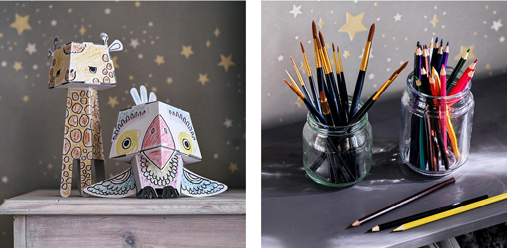 A cardboard kit can be painted in all the colors of the rainbow, but why stop there? Maybe the parrot has glittery wings or sequins on its beak. The kits are delivered as flat packaging and can then be colored and assembled using the assembly instructions on the back.
