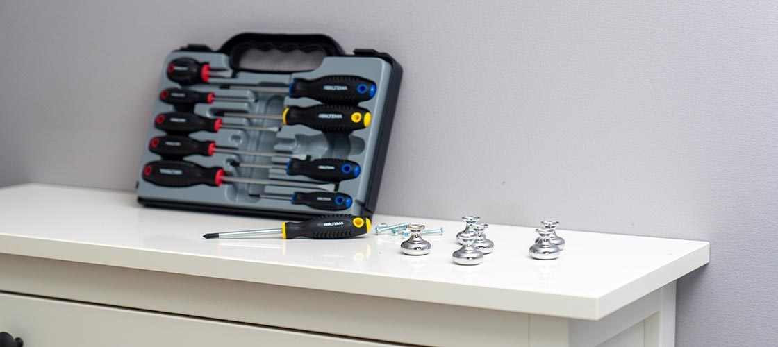“For example, you can give an old chest of drawers a completely new look by replacing the knobs. This can be done in a few minutes, and you only need new knobs and a screwdriver.”