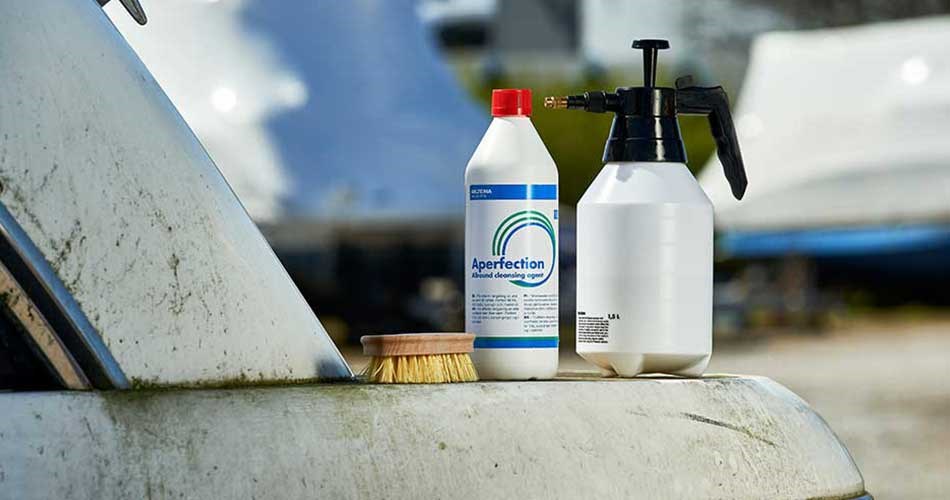 Remove algae, deposits and other coarse dirt from the hull. Here it may be easier to use a high-pressure sprayer, a good cleaning agent, and a sponge. Also remember to clean the deck with a mild boat shampoo.