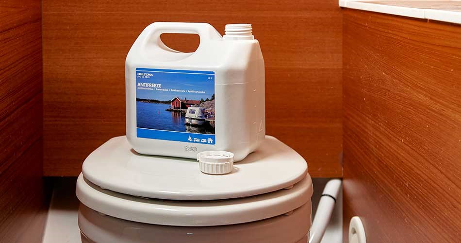 There is a good chance that frost will damage areas on the boat where there is water. When water freezes, it expands, which can damage the toilet and associated water pipes on board. Onboard water systems should therefore be frost-proofed. This can be done in two ways. Either drain the entire water system so that nothing can freeze, or pour antifreeze into the system, which lowers the freezing point. Both methods work well and can also be used in combination. When you need to drain it, you can drain and blow the hose dry. If it’s not possible to drain the water, an antifreeze can be used.