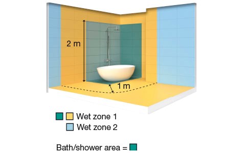 Walls by the bathtub/shower and wall surfaces at least 1 meter outside these, as well as the entire floor area of the wet room.