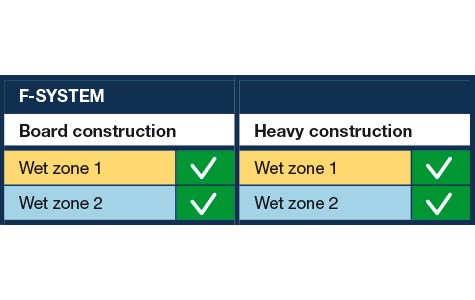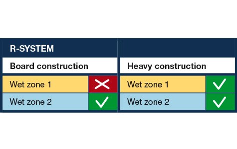 This means that the material you use must be from an approved system that meets the requirements for water and vapour density in the Swedish National Board of Housing and Urban Development's Building Regulations (BBR) and in the Swedish Building Ceramics Council's Industry Rules for Wet Rooms, applicable to BBV 21:1.