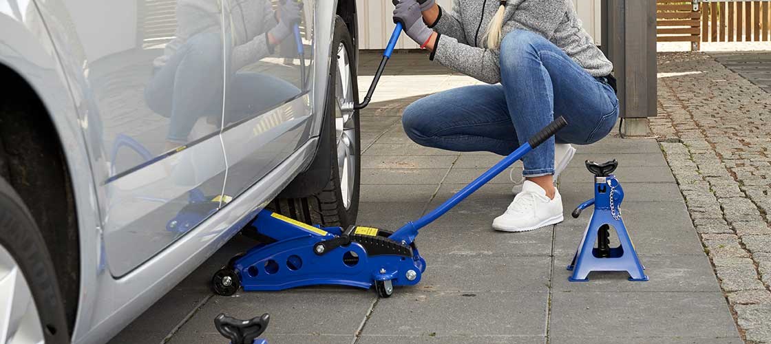 - Lokalisera lyftpunkterna: Lyftpunkterna är ofta markerade 20 centimeter från hjulet. Om du är osäker på var de är placerade hittar du information om detta i bilens manual. Placera sedan en domkraft mitt på lyftpunkten och hissa upp ett hjul i taget. Du hittar all vår lyftutrustning här.