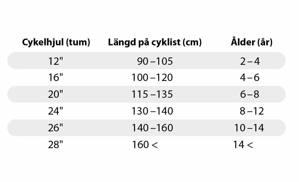 Vi har därför satsat på ett brett sortiment av cyklar i alla storlekar. Se tabellen nedan för att hitta rätt storlek till ditt barn: