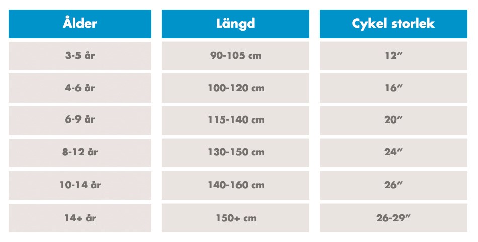 Observera att riktlinjerna endast är vägledande. Det betyder att om ditt barn är längre eller kortare än genomsnittet för sin ålder behöver du anpassa storleken på cykeln efter detta.