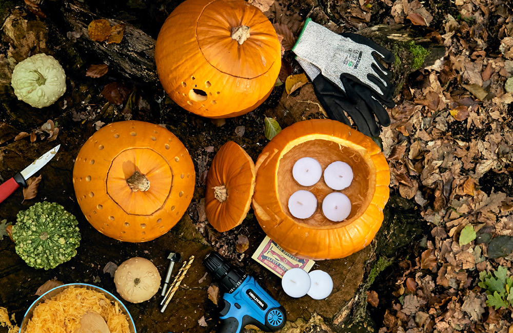 Vi börjar alltid med att skära upp ett lock högst upp på pumpan. När vi lyft ut det gröper vi ur pumpan med en stor sked eller en slev. Pumpaköttet kan man spara och göra till paj eller saftiga muffins, eller ha i en mustig gryta. Kärnorna kan man rosta och ha som salta tilltugg. Tänk på att inte göra väggarna för tunna, då säckar pumpan lättare ihop!
