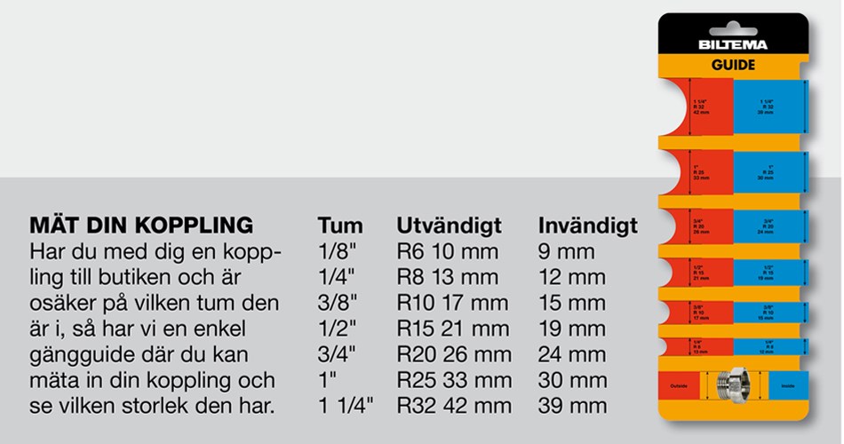 I tabellen nedan guider vi dig om de olika måtten i närmaste hela mm. Genom åren har tumgängor också fått olika namn, till exempel kan ½"-gänga även heta R15 eller G15.