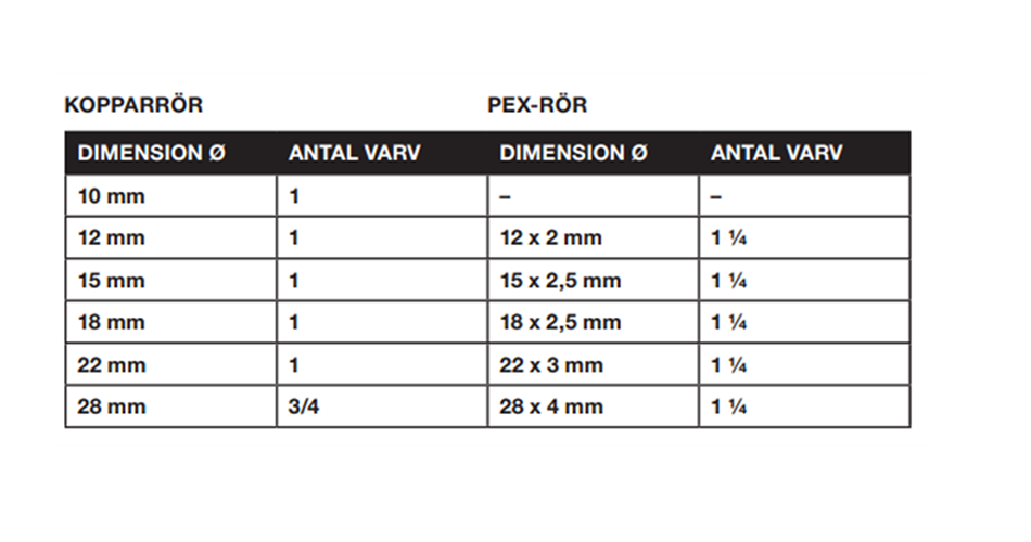 - Kopparrör: Stödhylsa för kopparrör ska användas för mjuka -och halvhårda kopparrör.