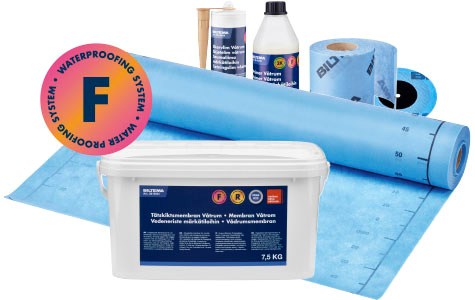 F-systemet är vårt foliebaserade system som består av ett färdigblandat tätskiktsmembran samt tätskiktsfolie. Folieduken tapetseras upp med membranet och tillsammans bildar de ett vatten- och ångtätt skikt för ditt våtrum. Systemet kompletteras med skarvlim, remsor och manschetter för att täta rörgenomföringar, vägg- och golvvinklar samt folieskarvar.