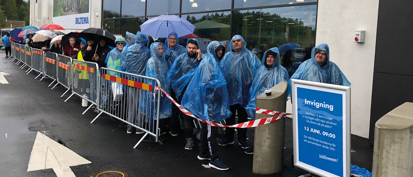 Torsdagsmorgonen bjöd på regnskurar och åska i handelsområdet Dalahästen i Avesta där Biltema idag slog upp dörrarna till sitt 51:a varuhus i Sverige. Trots det ruskiga vädret ringlade sig kön lång utmed parkeringen redan en timme innan öppning, där de som stod längst fram hade köat sedan kl. 15 dagen före.
