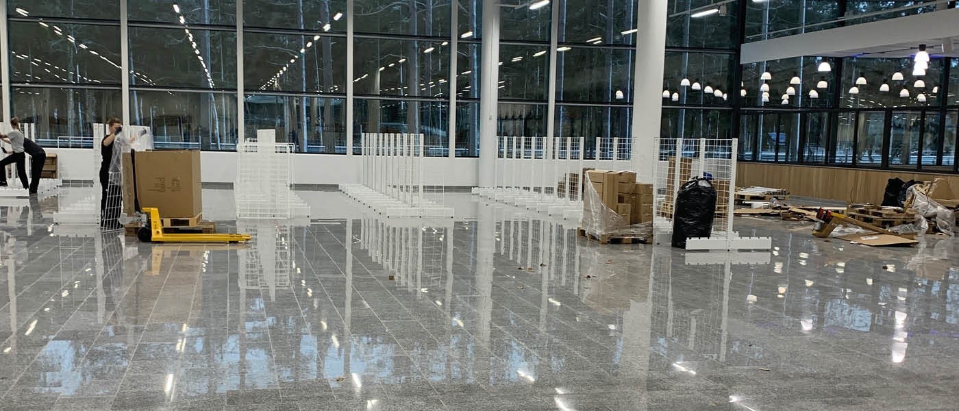 Just nu håller även vepor på att sättas upp för att klä väggarna med inspirerande bilder. Kassorna är på plats och caféet är färdigställt, förutom glassmaskinen som ska levereras de kommande dagarna.