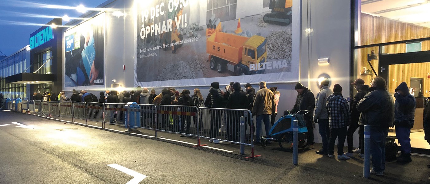 Denna torsdagsmorgon bjöd på regn och rusk då Biltema slog upp portarna till sitt nya varuhus i Lidköping. Redan en timme innan öppning ringlande sig kön lång längst fasaden, och de första besökarna var på plats redan kl. 05:20.