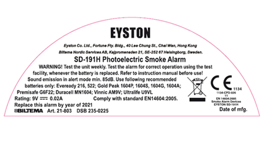 Biltema uppmanar kunder som köpt optisk brandvarnare (artikelnummer 21-803) att återlämna dessa till närmsta Biltema-varuhus. Biltema ersätter kunder med en ersättningsprodukt, brandvarnare 21-806 eller med inköpssumman av produkten. Inget kvitto krävs för att genomföra bytet. Återkallelsen gäller enbart om din brandvarnare är märkt enligt följande: