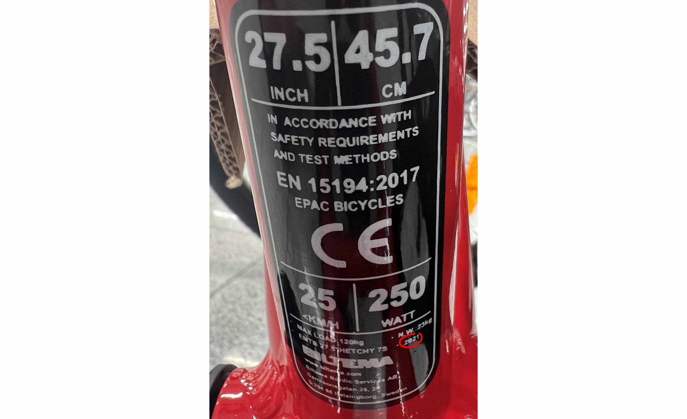 Biltema uppmanar alla kunder som har ovanstående elcykel med tillverkningsår 2021 att kontakta närmaste varuhus för att få cykeln åtgärdad.