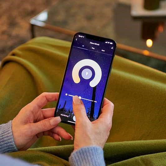 Med vår smarta belysning är det du som enkelt styr hur ditt hem ska vara upplyst. Låt belysningen spegla ditt humör och sätt stämningen genom att justera ljusstyrkan så som du vill ha den. Är du uppe tidiga morgnar är det perfekt att ha ett lite skarpare ljus, som piggar upp. Kanske arbetar du hemifrån och behöver då kunna justera ljusstyrkan, så att den anpassar sig till dagsljuset och du får en så bra arbetsmiljö som möjligt. Valmöjligheterna är många, tänd, släck, dimma och skifta mellan varmt och kallt ljus, bara genom ett knapptryck på telefonen.