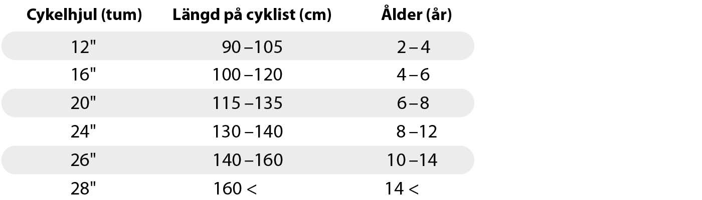 Använd dig av tabellen för att se vilken hjulstorlek som passar för ditt barn. När det gäller lite mindre barn är det viktigt att inte gå upp i storlek för tidigt – en tumregel är att barnet ska nå ner till marken med båda fötterna när hen sitter på sadeln.